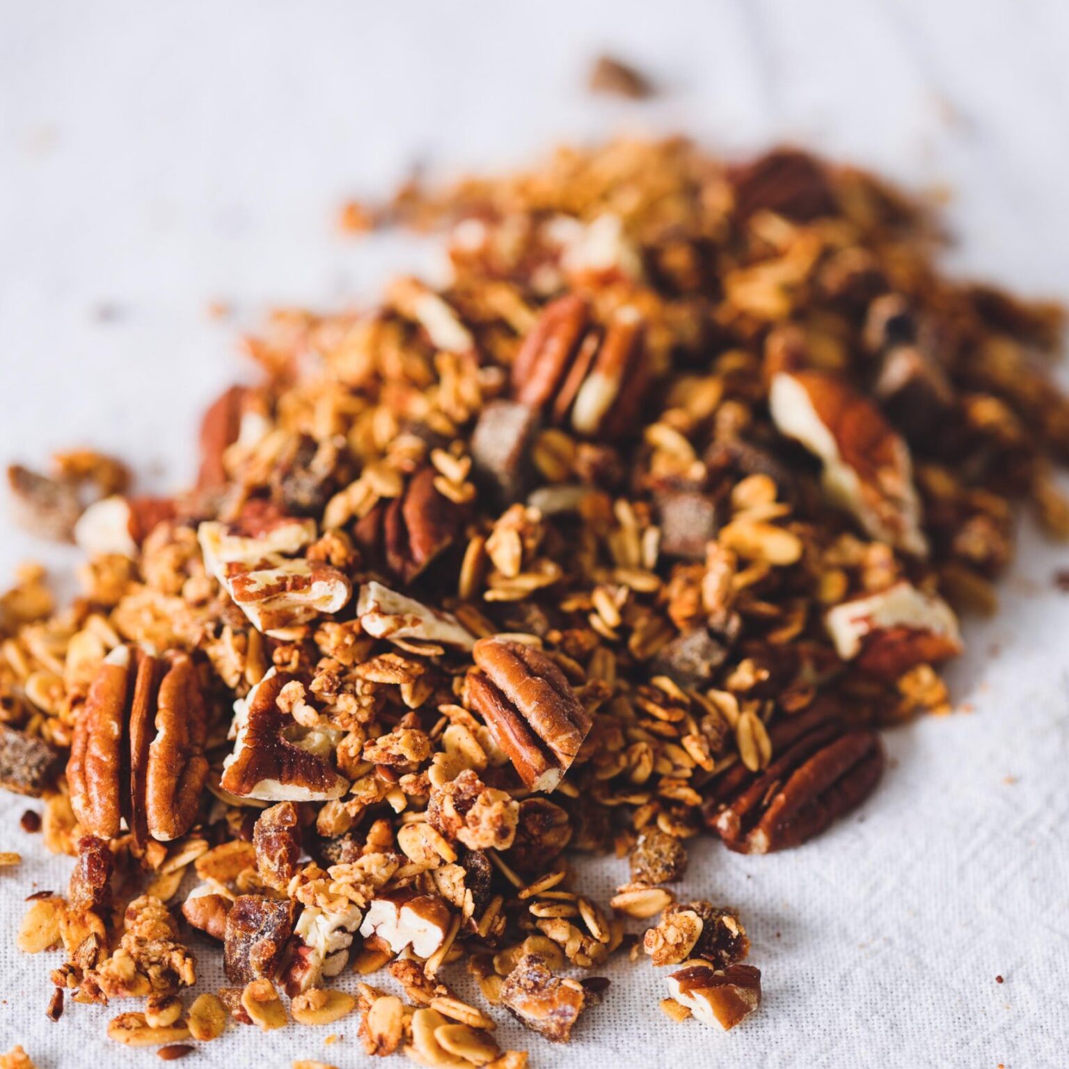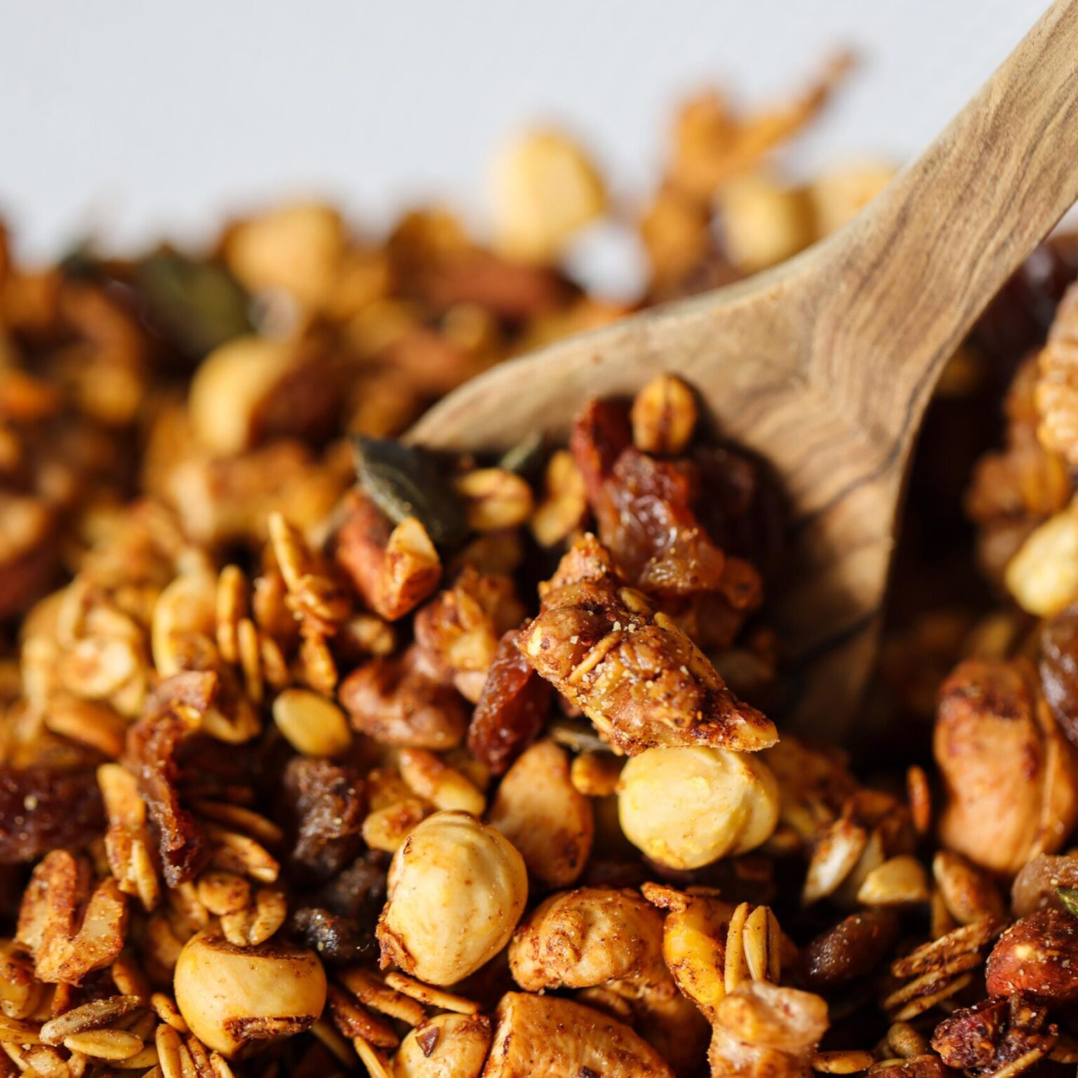 De zorgvuldig samengestelde en royaal gevulde granola wordt met liefde gebakken.